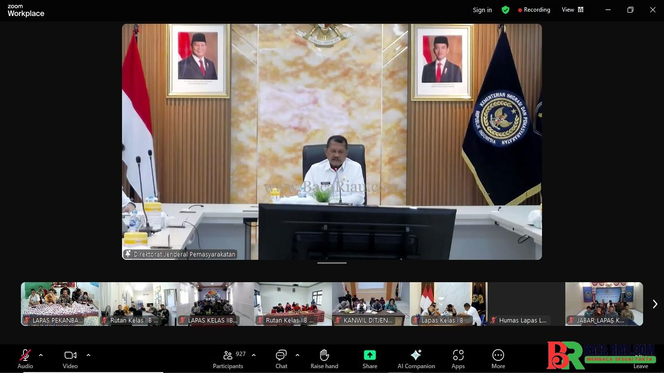 PEKANBARU – BACARIAU.COM – Lembaga Pemasyarakatan (Lapas) Kelas IIA Pekanbaru mengikuti pengarahan langsung dari Direktur Jenderal Pemasyarakatan Kementerian Imigrasi dan Pemasyarakatan RI, Drs. Mashudi, secara virtual. Pengarahan ini diikuti oleh seluruh Kepala Unit Pelaksana Teknis (Ka.UPT) beserta jajaran Pemasyarakatan se-Indonesia, Jum’at (9/5/2025).