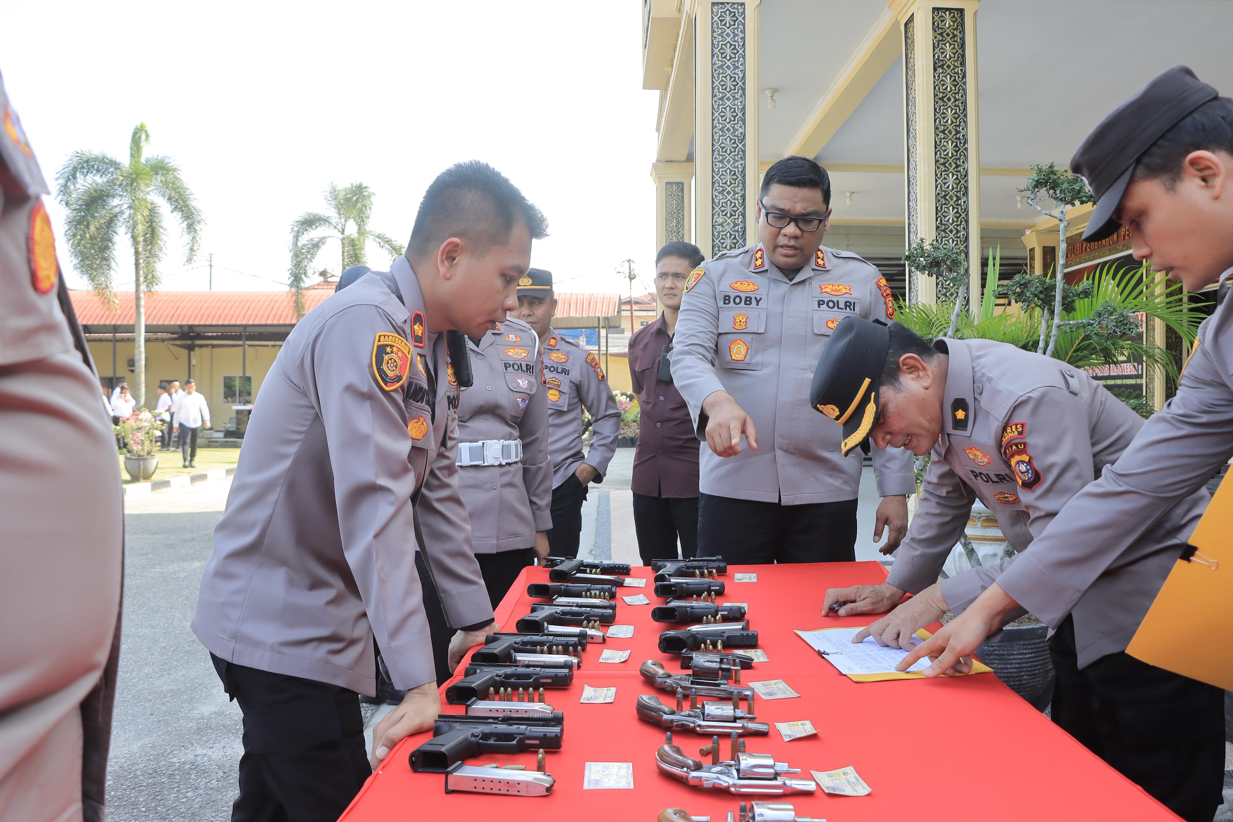KAMPAR – BACARIAU.COM– Kapolres Kampar AKBP Boby Putra Ramadhan S didampingi Wakapolres Kampar Kompol Andi Cakra Putra dan PJU Polres Kampar melakukan pengecekan mendadak terhadap 15 orang personel Polres Kampar pemegang senjata api (senpi), Senin (6/10/2025). Pengecekan ini bertujuan untuk memastikan bahwa seluruh personel mematuhi prosedur penggunaan senpi yang aman dan bertanggung jawab.