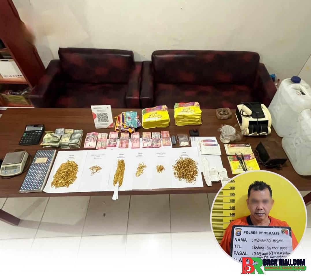 Menindaklanjuti laporan tersebut, Tim Resmob Polres Bengkalis melakukan penyelidikan dan penggerebekan. Dari toko pelaku, polisi menyita ratusan perhiasan emas palsu dengan berat total lebih dari 1,8 kilogram, cairan kimia, alat sepuh, timbangan digital, cap stempel, dokumen pendukung, dan uang tunai.