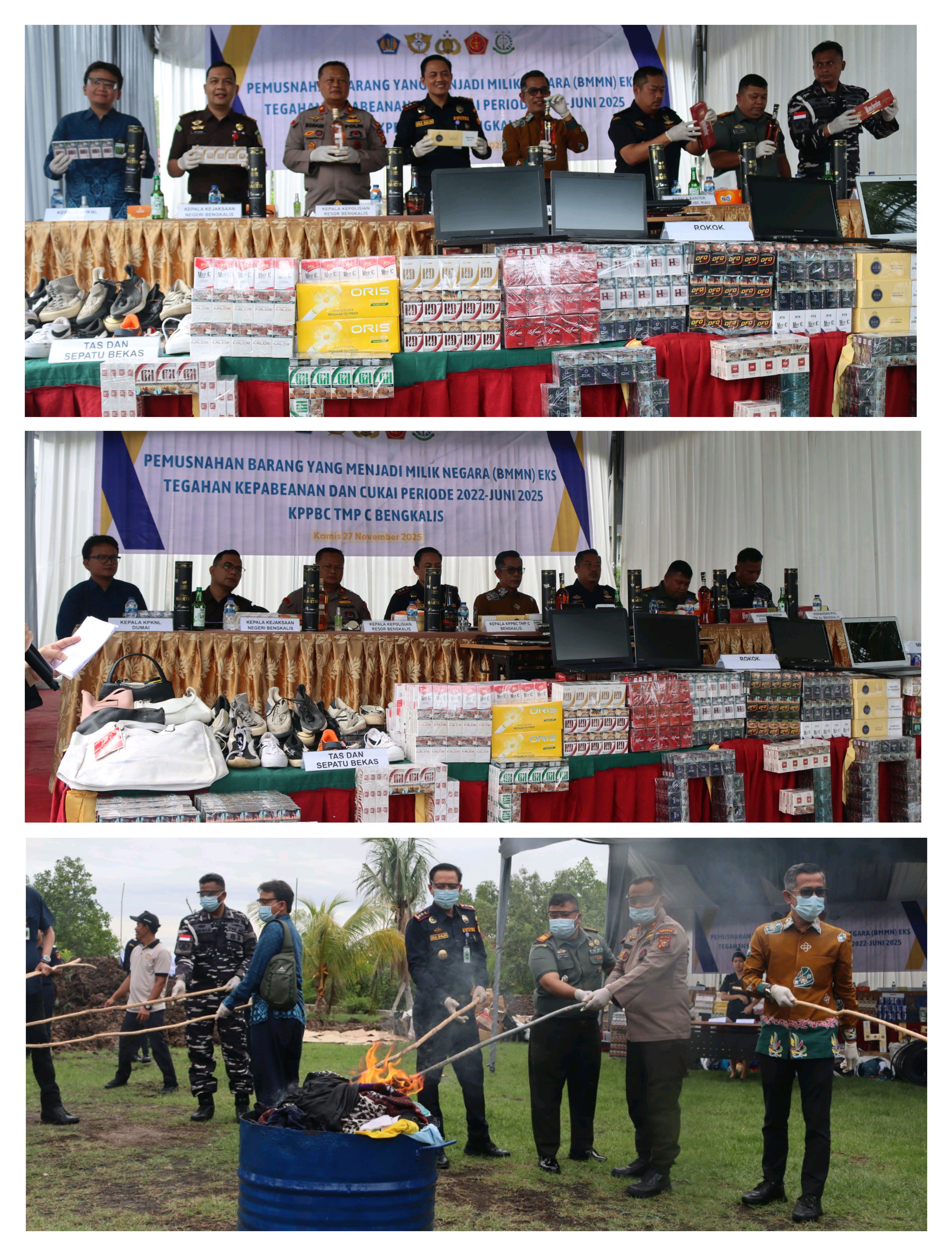 – 27 .November 2025, Bea Cukai Bengkalis melaksanakan Pemusnahan atas Barang Yang Menjadi Milik Negara (BMMN) pada Kamis (27/11) di Kantor Bantu Bea Cukai Bengkalis di Sungai Pakning. Kegiatan pemusnahan ini merupakan tindak lanjut dari penindakan di bidang Kepabeanan dan Cukai yang telah dilaksanakan oleh Bea Cukai Bengkalis periode tahun 2022 hingga Juni 2025 meliputi Pakaian Bekas, Rokok tanpa pita cukai, Minuman Mengandung Etil Alkohol (MMEA), Barang Elektronik, Obat-Obatan, Kosmetik, Sepatu Bekas, ban bekas dan barang lainnya dengan perkiraan nilai barang sebesar Rp.1.882.516.812 (Satu Miliar Delapan Ratus Delapan Puluh Dua Juta Lima Ratus Enam Belas Ribu Delapan Ratus Dua Belas Rupiah).