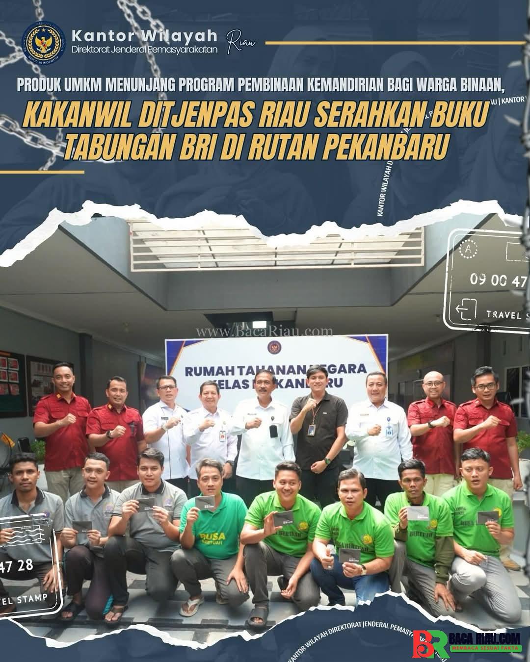 PEKANBARU –  BACARIAU.COM – Dalam rangka mendukung pelaksanaan 13 Program Akselerasi yang dicanangkan oleh Menteri Imigrasi dan Pemasyarakatan, khususnya dalam hal Penguatan dan Peningkatan Pendayagunaan Warga Binaan Untuk Menghasilkan Produk UMKM, Rumah Tahanan Negara Kelas I Pekanbaru bekerja sama dengan PT Bank Rakyat Indonesia (Persero) Tbk (BRI) menyelenggarakan kegiatan penyerahan buku tabungan kepada para WBP. Buku tabungan diserahkan langsung oleh Kakanwil Ditjenpas Riau. Kegiatan ini bertujuan untuk memberikan akses ke layanan keuangan formal sebagai bagian dari upaya pembinaan kemandirian serta integrasi sosial-ekonomi WBP selama dan setelah menjalani masa pidana.