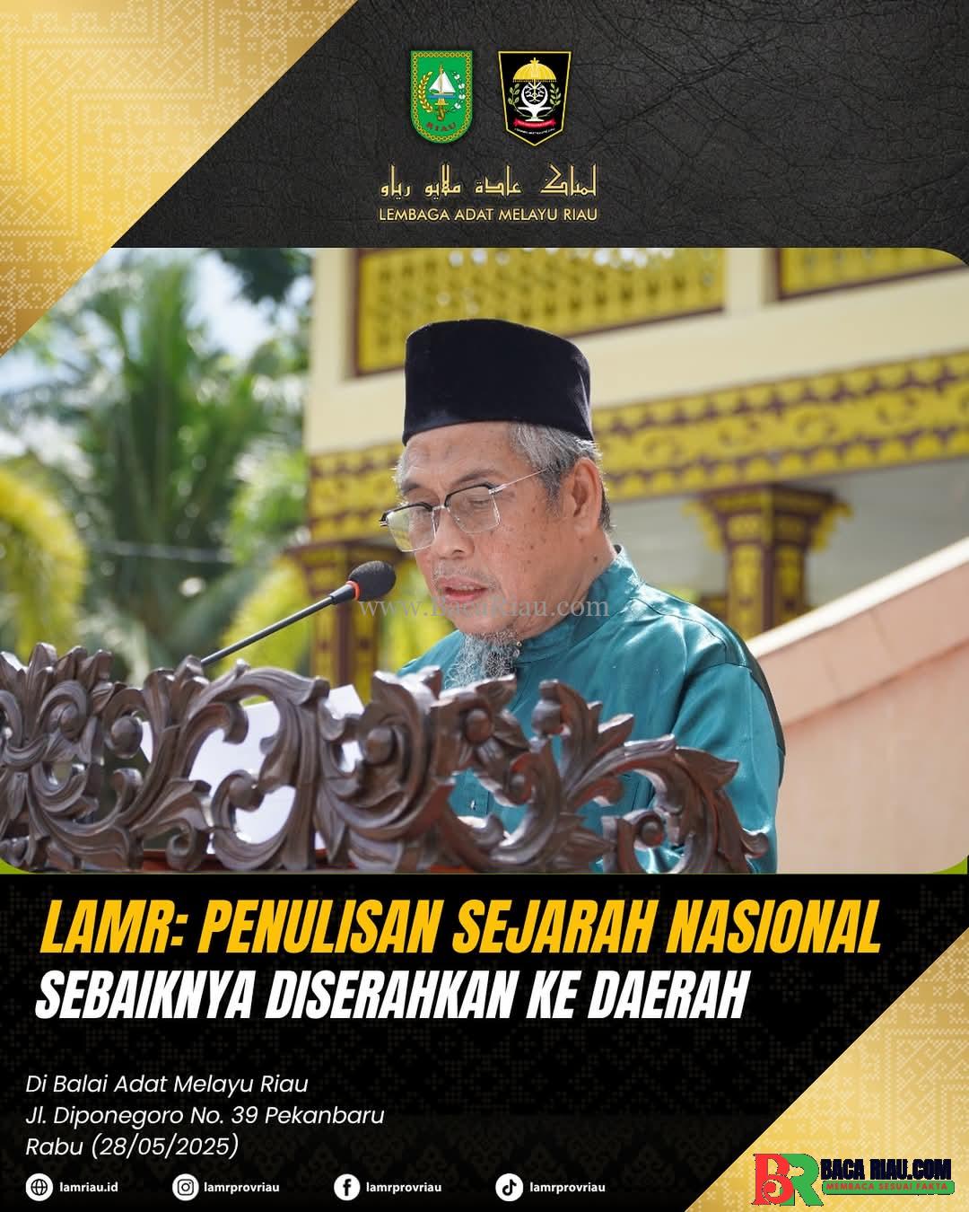 Demikian Ketua Umum Dewan Pimpinan Harian Lembaga Adat Melayu Riau (Ketum DPH LAMR) Provinsi Riau, Datuk Seri H. Taufik Ikram Jamil, hari Rabu (28/5), menanggapi program Kementerian Kebudayaan mengenai penulisan kembali sejarah nasional yang hasilnya akan dibentangkan pada Agustus mendatang.