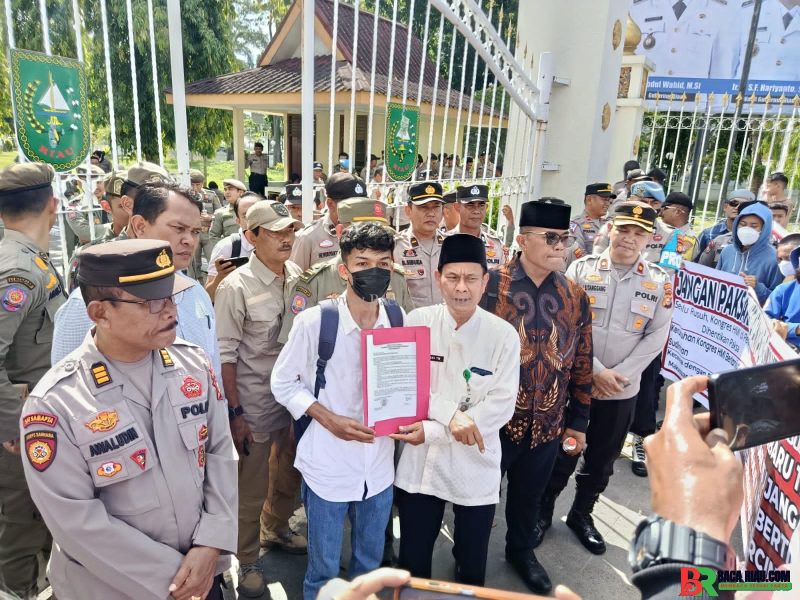 Korlap aksi menyampaikan “Panjang umur kawan,kami atas mahasiswa,Kami atas nama masyarakat Indonesia, yang mana kita sudah berkaca dalam 10 tahun yang lalu bagaimana sudah menjadi kerusuhan dan kekacauan dan kami berjanji, akan terus berjuang dan menolak tegas terbentuknya Kongres HMI di pekanbaru. “Paparnya