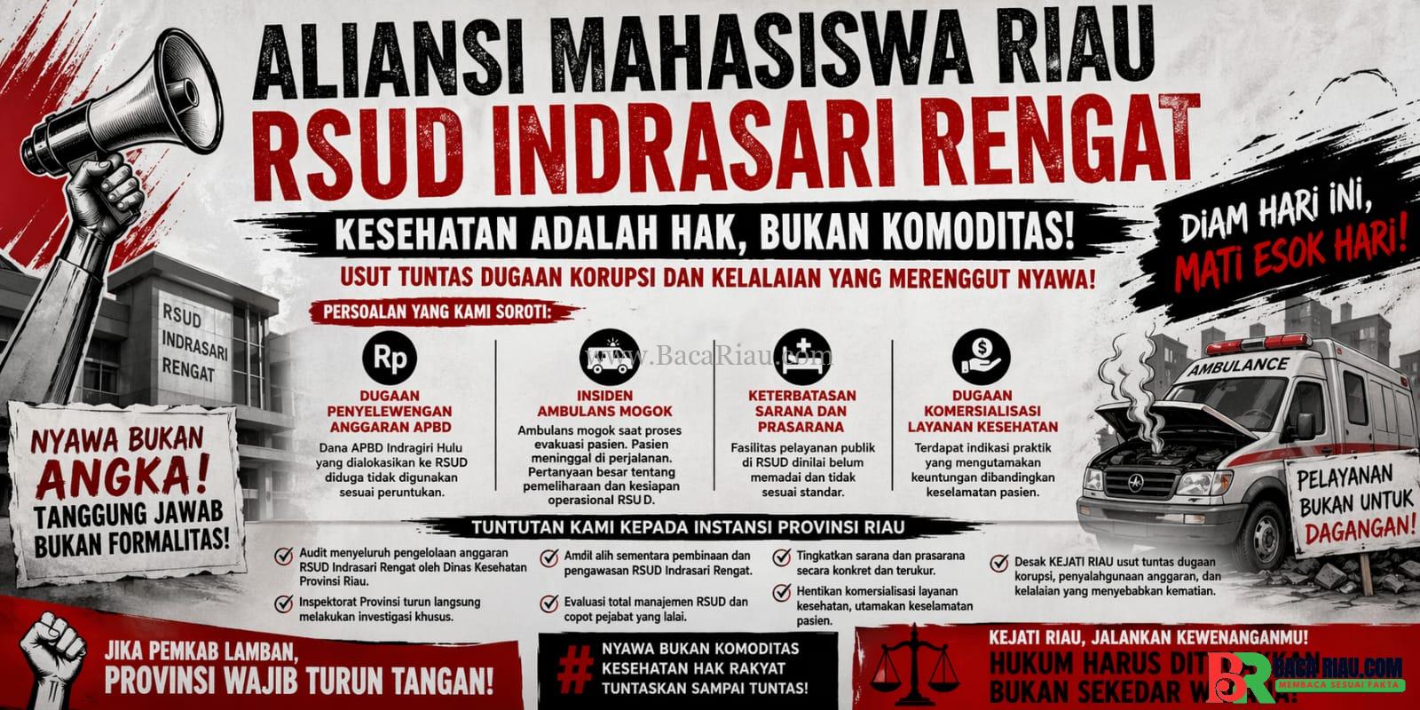 PEKANBARU-BACARIAU.COM-,Jum’at 24 April 2026— Aliansi Mahasiswa Riau menyatakan akan menggelar aksi unjuk rasa dalam waktu dekat sebagai bentuk desakan terhadap Kejaksaan Tinggi Riau agar segera mengambil langkah tegas dalam mengusut dugaan pelanggaran hukum di RSUD Indrasari Rengat, Kabupaten Indragiri Hulu.