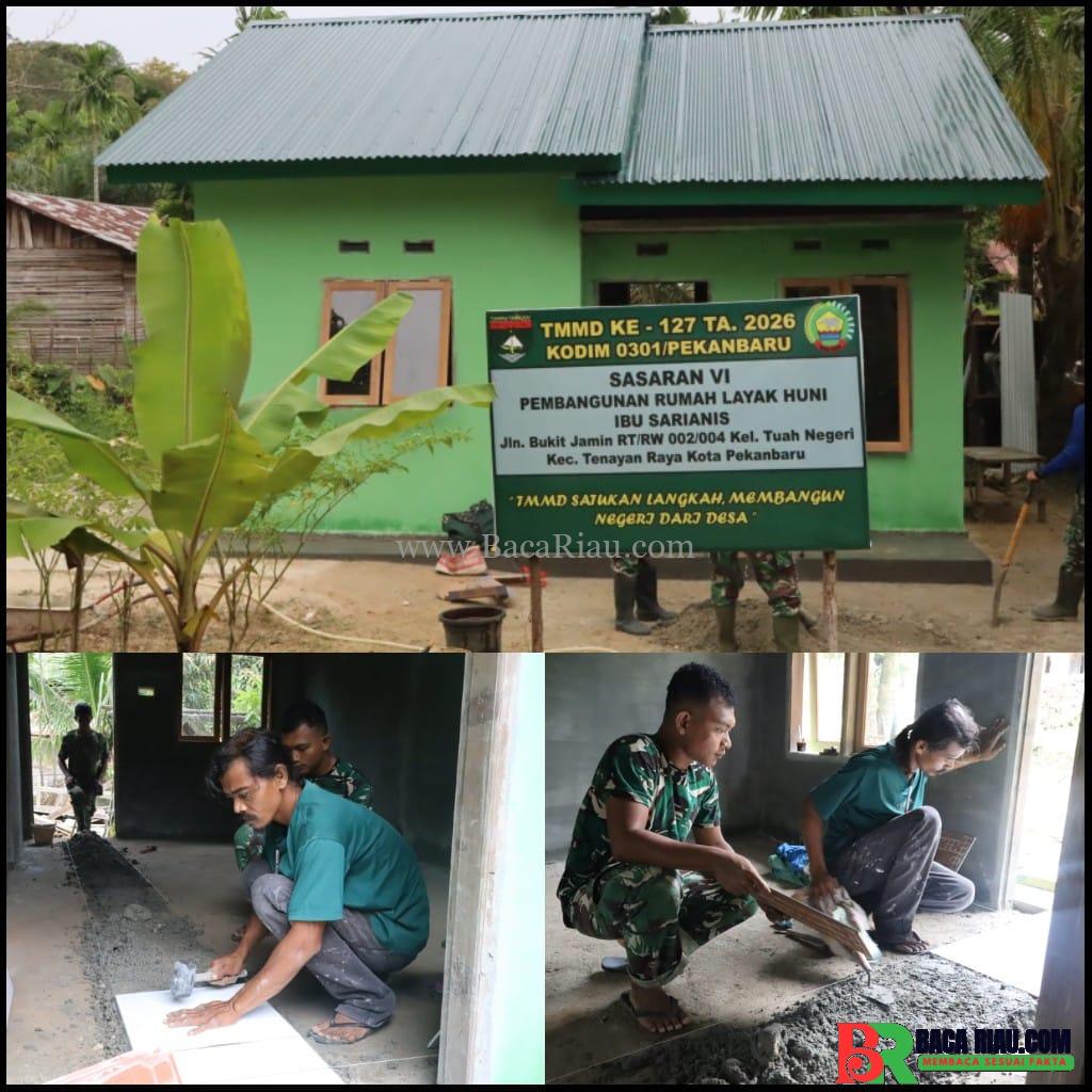 PEKANBARU -Di bawah semangat kebersamaan dan kepedulian terhadap masyarakat, Satgas TMMD ke-127 Kodim 0301/Pekanbaru terus menunjukkan komitmennya dalam membantu warga melalui program pembangunan Rumah Tidak Layak Huni (RTLH). Salah satu sasaran yang kini hampir rampung adalah rumah milik Ibu Sarianis (58), yang beralamat di Jalan Bukit Jamin RT/RW 002/004, Kelurahan Tuah Negeri, Kecamatan Tenayan Raya, Kota Pekanbaru, Kamis (5/3/2026).