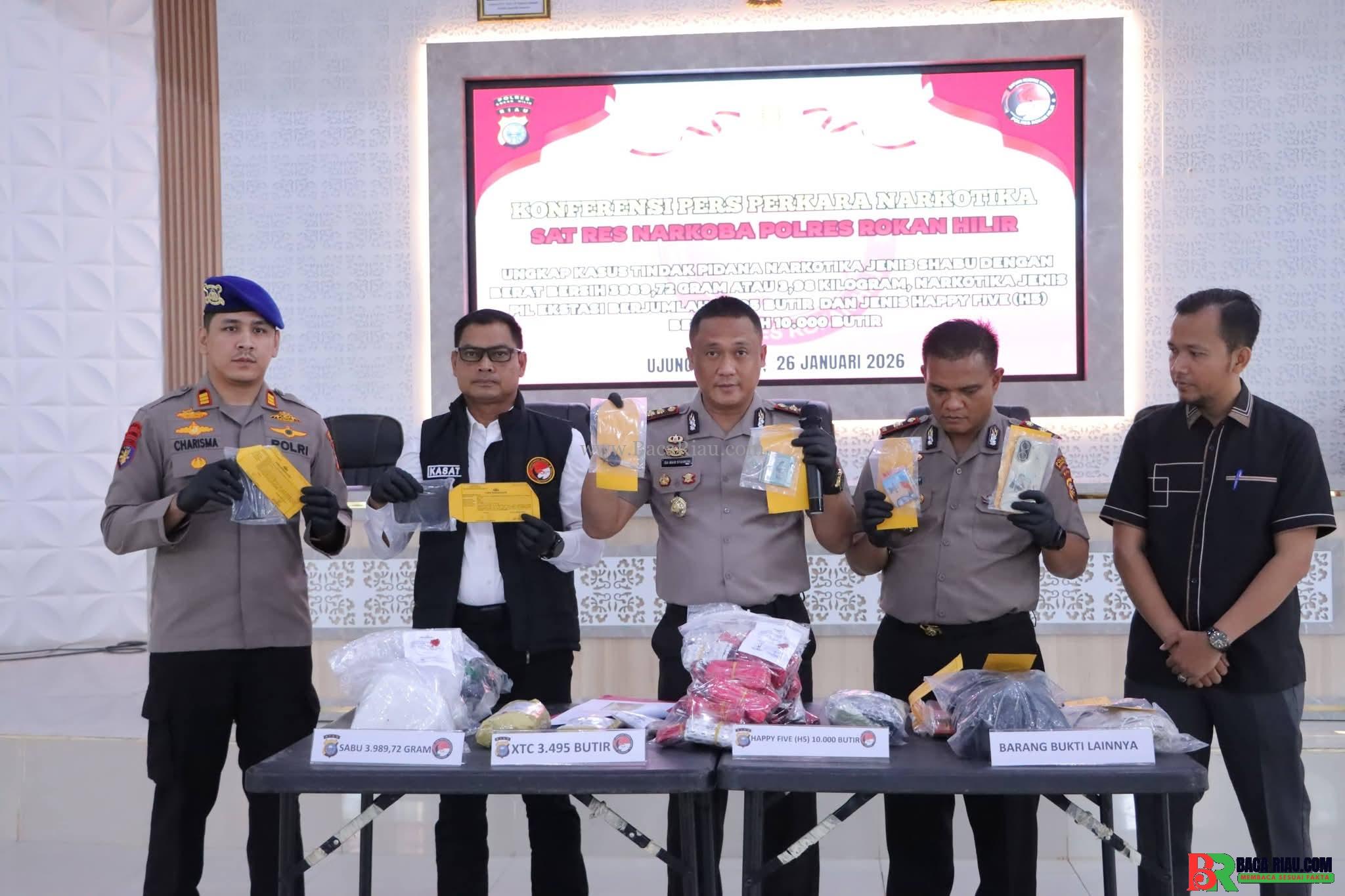 ROKAN HILIR – Satuan Reserse Narkoba Polres Rokan Hilir kembali menorehkan prestasi besar di awal tahun 2026 dengan mengungkap peredaran narkotika jaringan internasional. Dalam konferensi pers yang digelar pada Senin (26/1/2026) pukul 10.00 WIB di Tunggal Panaluan Polres Rohil, polisi memaparkan keberhasilan pengungkapan narkotika dengan barang bukti sabu seberat 3.989,72 gram (3,98 kilogram), ekstasi sebanyak 3.495 butir, serta happy five (HS) sebanyak 10.000 butir.