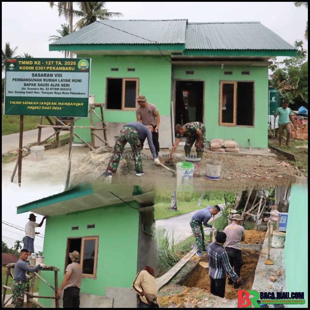 PEKANBARU – BACARIAU.COM– Semangat pengabdian tanpa batas terus ditunjukkan oleh Satuan Tugas TNI Manunggal Membangun Desa (TMMD) ke-127 dari Kodim 0301/Pekanbaru. Di tengah pelaksanaan ibadah puasa, para personel Satgas tetap konsisten dan penuh dedikasi dalam menggesa pembangunan Rumah Tidak Layak Huni (RTLH) milik Bapak Saudi Alfa Seri (45), yang beralamat di Jalan Sumatra No. 22 RT/RW 005/012, Kelurahan Sialang Sakti, Kecamatan Tenayan Raya, Kota Pekanbaru. Kamis, 05 Maret 2026.