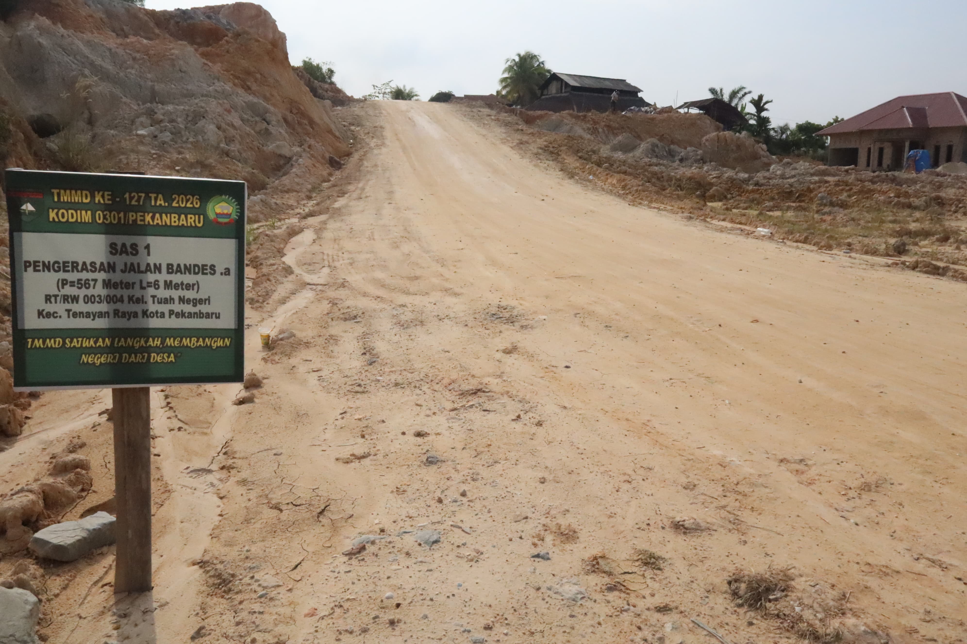PEKANBARU -Program TNI Manunggal Membangun Desa (TMMD) ke-127 Kodim 0301/Pekanbaru terus memberikan dampak nyata bagi masyarakat. Sejumlah sasaran fisik berupa pengerasan jalan di beberapa titik kini telah rampung 100 persen dan siap dimanfaatkan oleh warga.