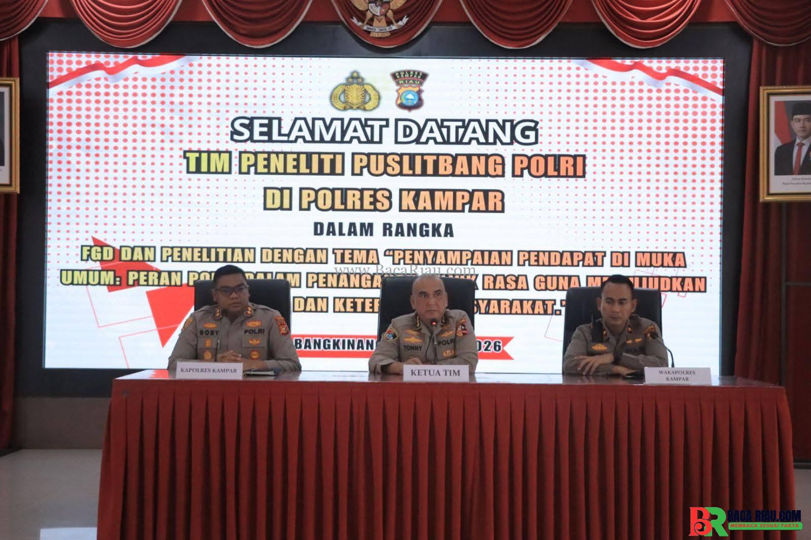 KAMPAR | BACARIAU.COM- Bertempat di Aula Sanika Satyawada Polres Kampar, hari Selasa, (3/3/2026), pukul 13.00 WIB, seluruh rangkaian kegiatan penelitian dari Pusat Penelitian dan Pengembangan (Puslitbang) Polri tentang “Penyampaian Pendapat di Muka Umum, Peran Polri dalam Penanganan Unjuk Rasa/Demonstrasi Guna Mewujudkan Keamanan dan Ketertiban Masyarakat Tahun 2026” berhasil dilaksanakan dengan baik dan penuh kekhidmatan.